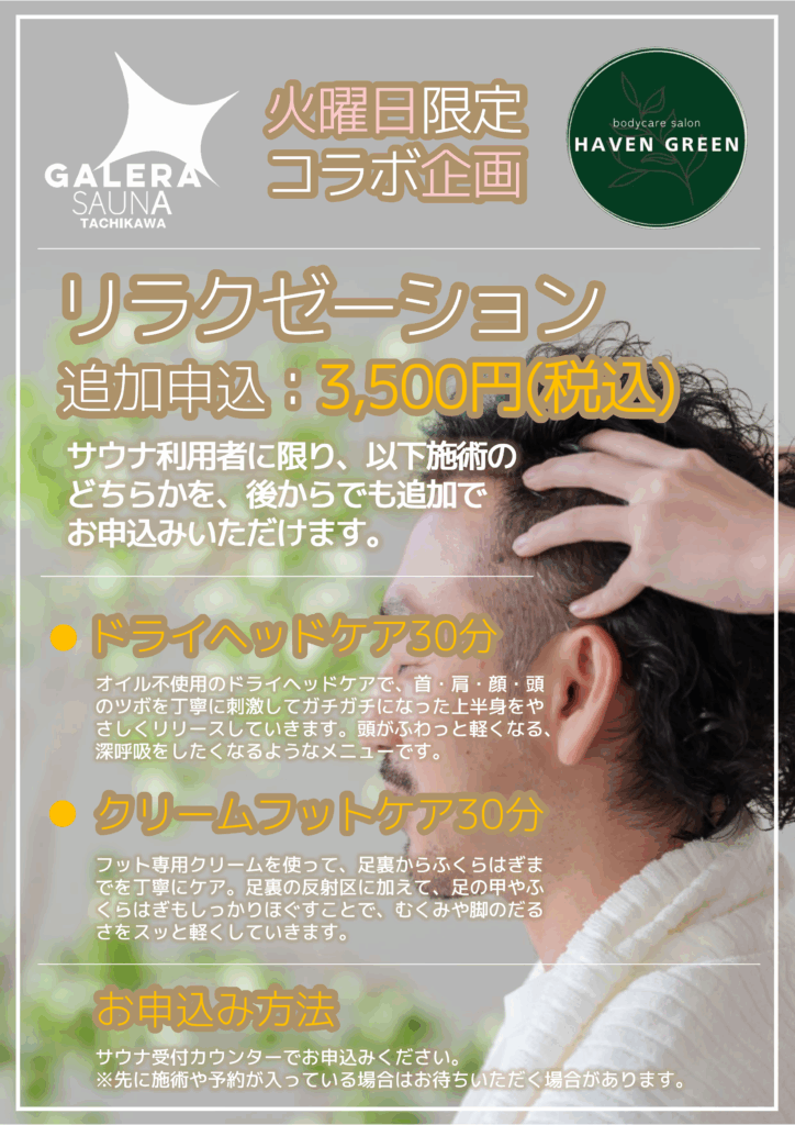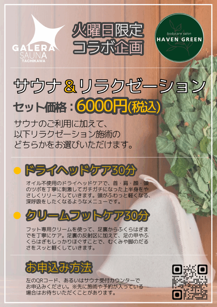 毎週火曜日、ガレーラ・サウナでは同じ建物内のリラクゼーション「HAVEN GREEN」とコラボレーションを行っています。